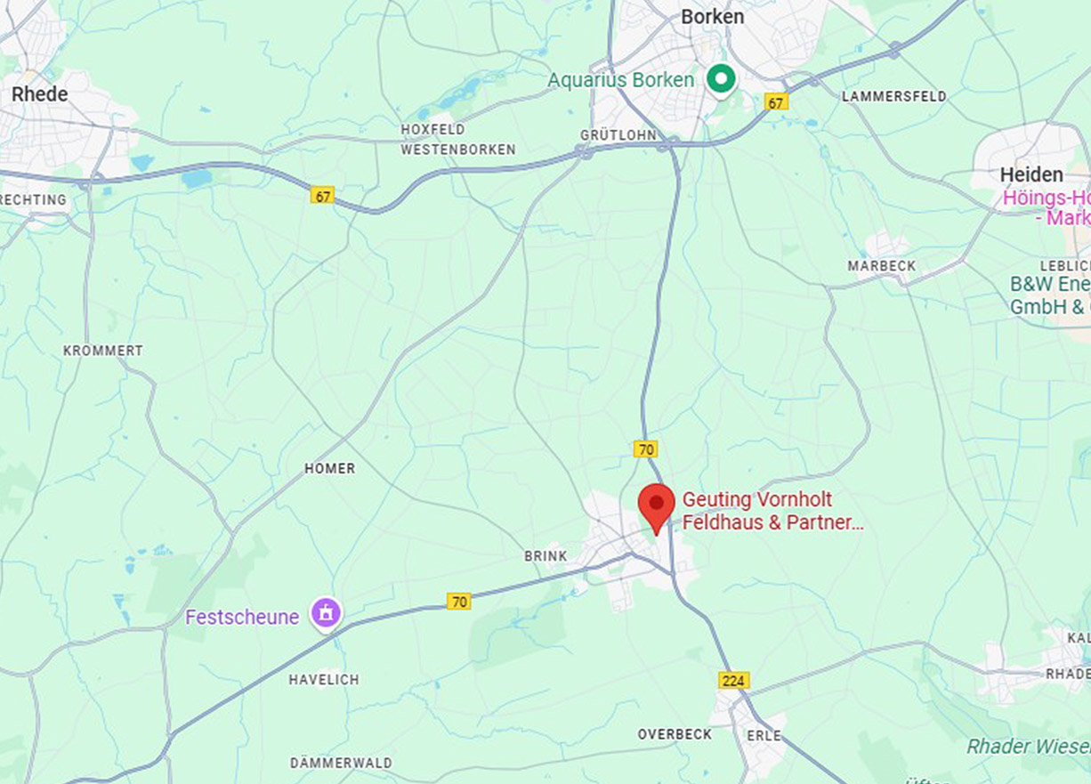 Unser modernes Kanzleigebäude liegt im Nordosten von Raesfeld und ist über die B70 schnell zu erreichen. Bis zur A31 sind es ca. 20 Minuten. Direkt vor der Tür befinden sich ausreichend Parkplätze, inklusive zweier Ladepunkte für E-Autos und einer Stromtankstelle für E-Bikes. Es gibt eine Busverbindung nach Dorsten und Borken. Die Haltestelle liegt 10 Gehminuten von der Kanzlei entfernt.
